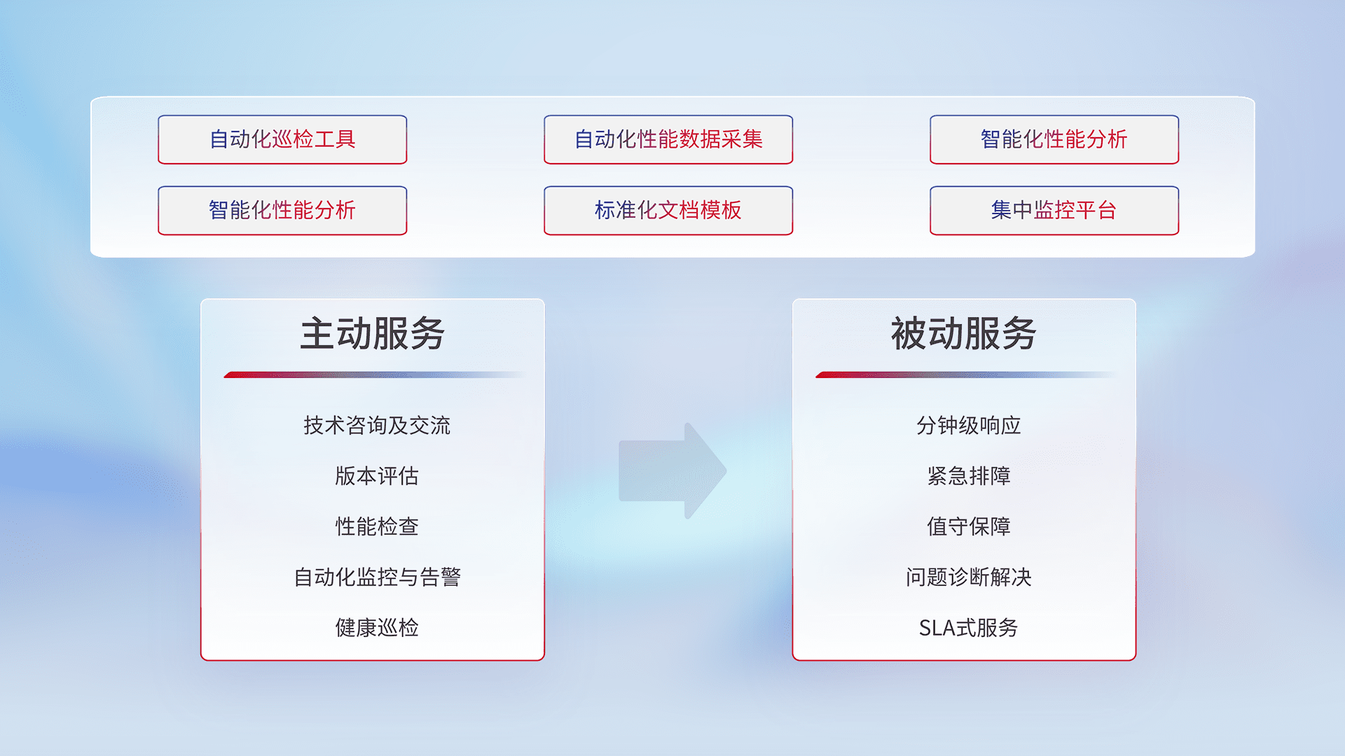 智能化工具和标准化文档,,,保障服务质量,,提供主动服务(包含技术咨询、、、、版本评估、、、性能检查、、、自动化监控与告警、、健康巡检)和被动服务包含(分钟级响应、、紧急排障、、、、值守保障、、问题诊断解决、、、SLA服务)。。